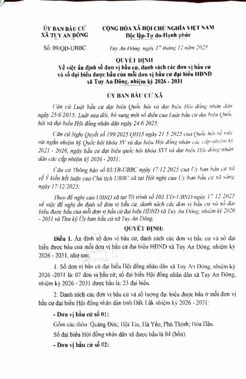 | Tiêu đề văn bản | Quyết định về việc ấn định số đơn vị bầu cử, danh sách các đơn vị bầu cử và số đại biểu được bầu cử của mỗi đơn vị bầu cử đại biểu HĐND xã Tuy An Đông, nhiệm kỳ 2026 - 2031 | ||