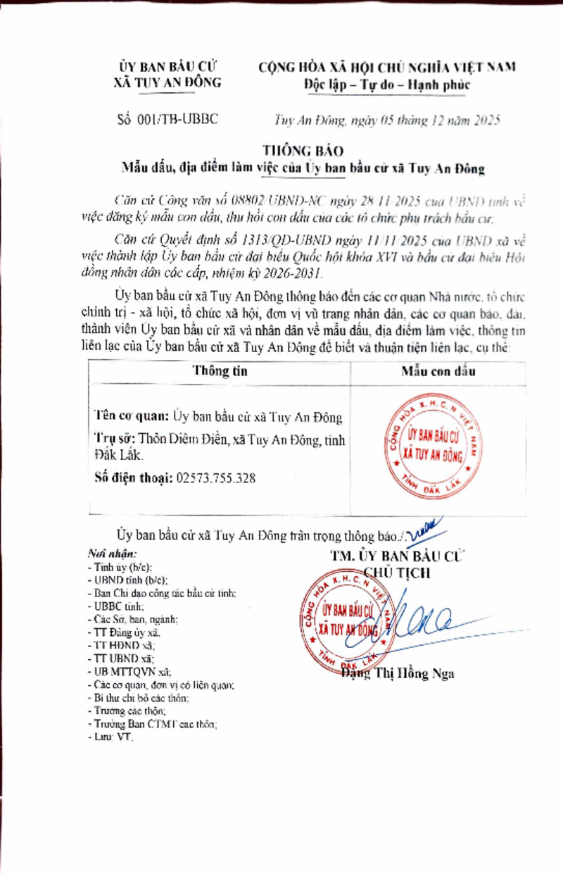 | Tài liệu đính kèm | File đính kèm | Thông báo mẫu dấu, địa điểm làm việc của Ủy ban bầu cử xã Tuy An Đông | |