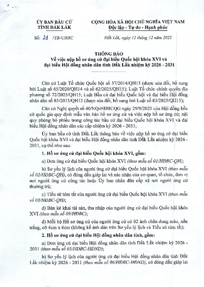 | Tiêu đề văn bản | Thông báo về việc nộp hồ sơ ứng cử đại biểu Quốc hội khóa XVI và địa biểu HĐND tỉnh Đắk Lắk nhiệm kỳ 2026 - 2031 | ||