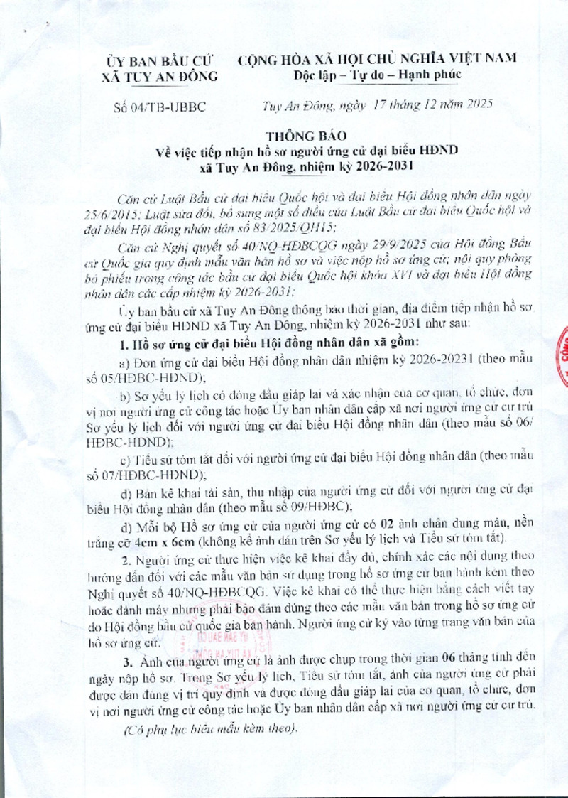 | Tiêu đề văn bản | Thông báo về việc tiếp nhận hồ sơ người ứng cử địa biểu HĐND xã Tuy An Đông, nhiệm kỳ 2026 - 2031 | ||