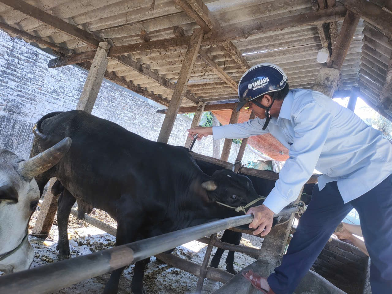Cán bộ thú y tiến hành tiêm phòng vắc xin Viêm da nổi cục trên trâu, bò