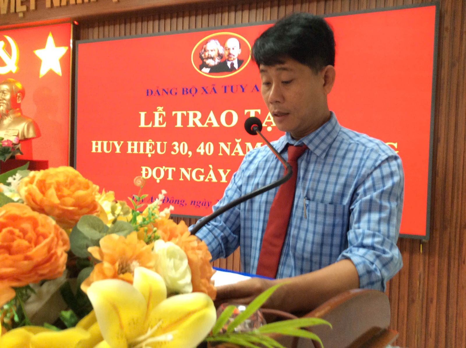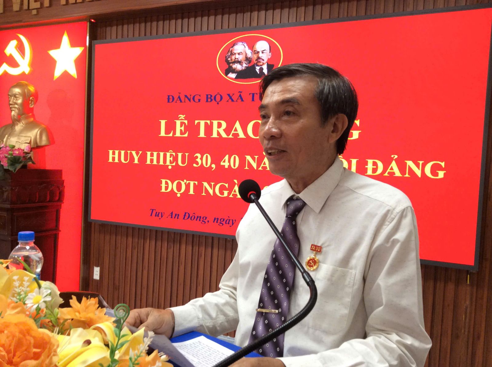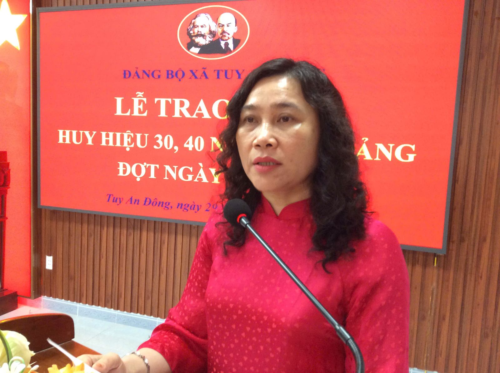 Phát biểu tại Lễ trao tặng Huy hiệu Đảng, đồng chí Đặng Thị Hồng Nga, Bí thư Đảng uỷ xã Tuy An Đông chúc mừng và trân trọng tri ân những đóng góp to lớn của các đảng viên đối với sự nghiệp cách mạng của Đảng, trong công cuộc xây dựng và bảo vệ Tổ quốc. Đồng chí khẳng định, đây không chỉ là niềm vinh dự đối với các đồng chí đảng viên và gia đình mà còn là vinh dự của Đảng bộ địa phương Tuy An Đông chúng ta. Đồng chí Bí thư Đảng ủy chúc các đồng chí đảng viên luôn mạnh khỏe và mong muốn các đảng viên tiếp tục phát huy trí tuệ, kinh nghiệm của mình góp sức xây dựng Đảng, chính quyền ngày càng trong sạch, vững mạnh và là tấm gương sáng cho thế hệ trẻ học tập và noi theo.