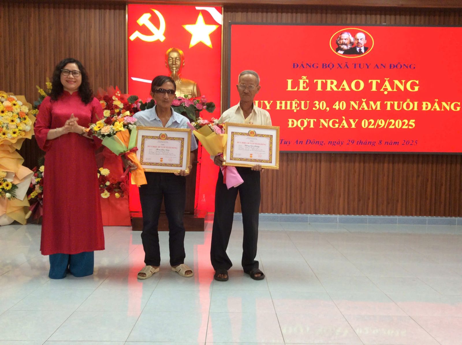 Nhân kỷ niệm 80 năm cách mạng tháng 8 và Quốc Khánh nước cộng hoà xã hội chủ nghĩa Việt Nam (2/9/1945-2/9/2025). Sáng ngày 29/8/2025, Ban Thường vụ Đảng uỷ xã Tuy An Đông tổ chức Lễ trao Huy hiệu 30 và 40 năm tuổi đảng cho 07 Đảng viên trên địa bàn xã Tuy An Đông.