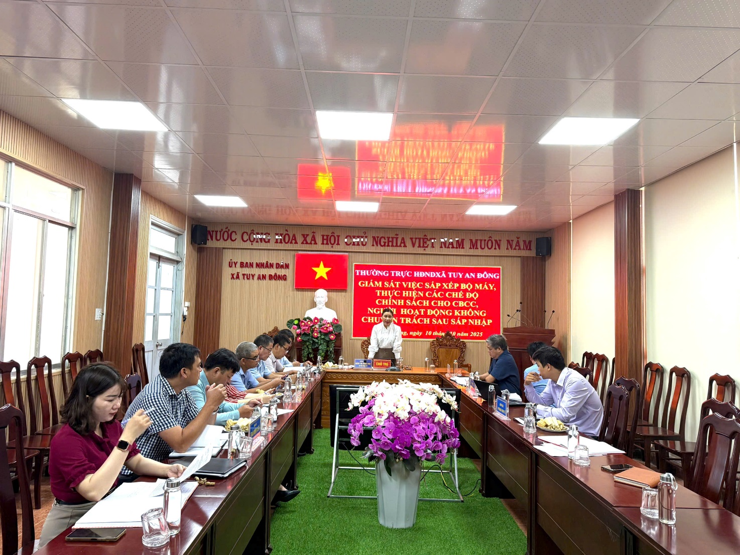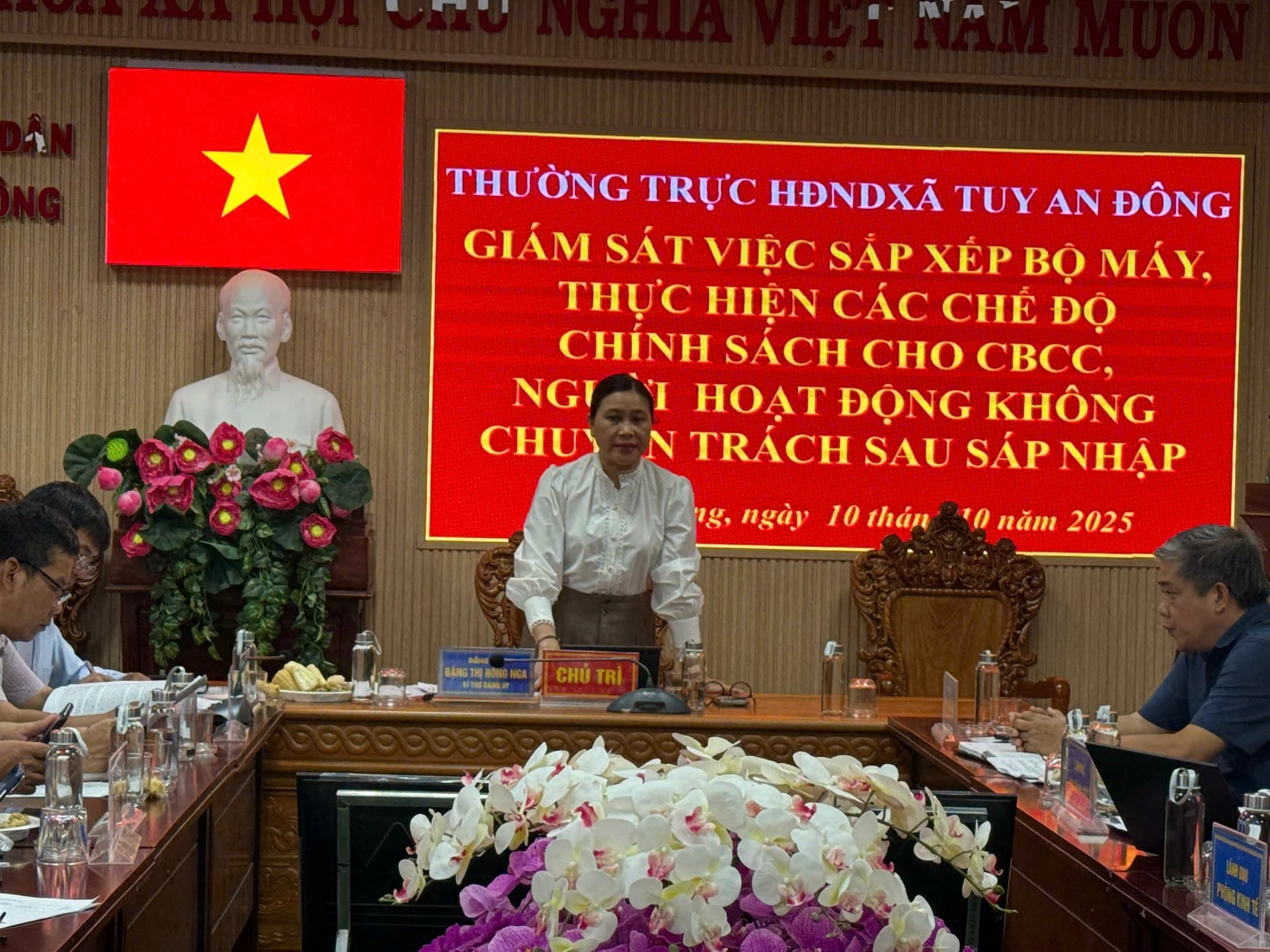 Sáng ngày 10/10/2025, Thường trực Hội đồng nhân dân xã Tuy An Đông đã tổ chức buổi giám sát chuyên đề về công tác sắp xếp tổ chức bộ máy, thực hiện các chế độ, chính sách đối với cán bộ, công chức, người hoạt động không chuyên trách sau sáp nhập đơn vị hành chính.