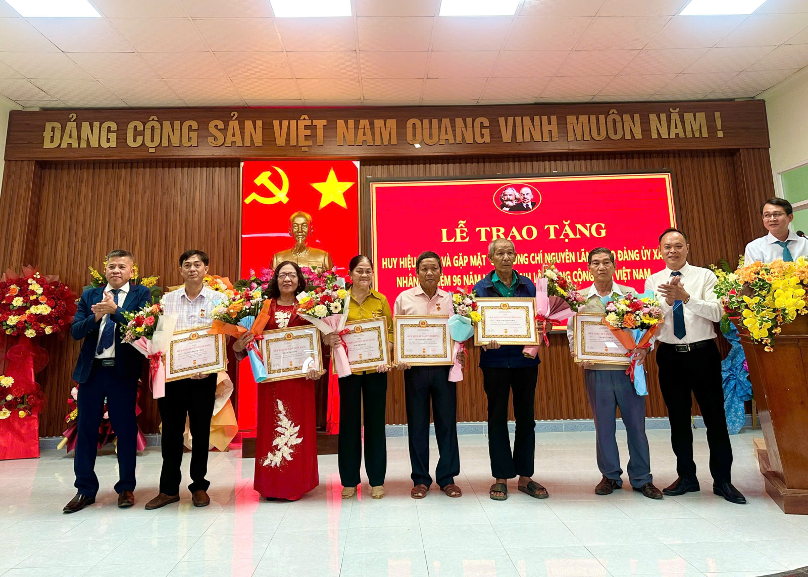 Thường trực Đảng ủy xã Tuy An Đông trao huy hiệu Đảng và tặng hoa chúc mừng các đảng viên được nhận huy hiệu Đảng