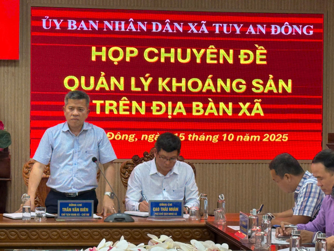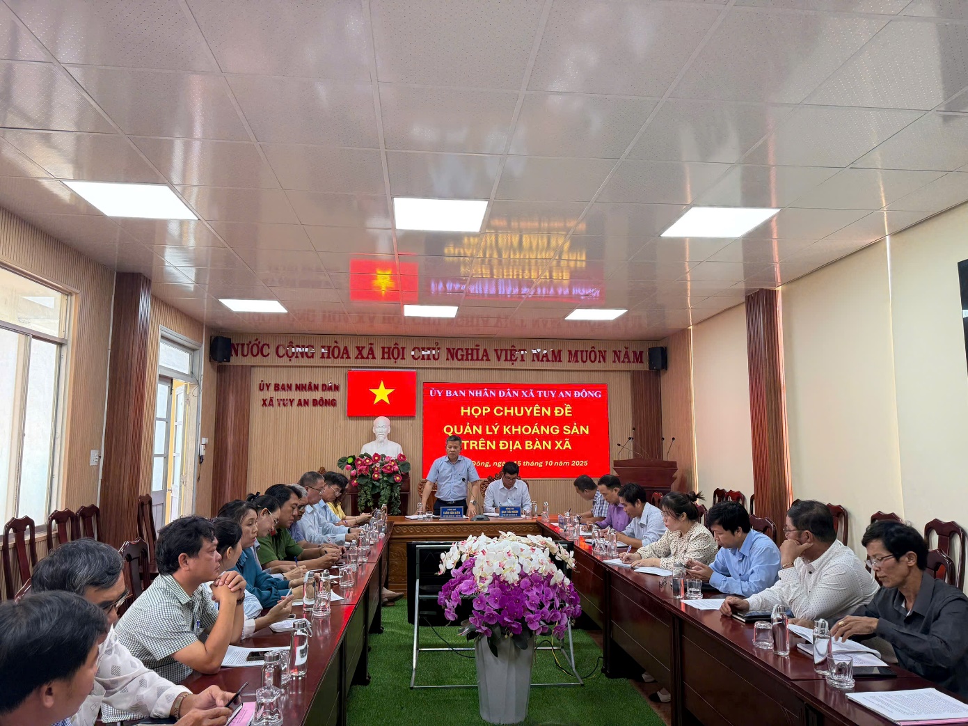 Sáng ngày 15/10/2025, Ủy ban nhân dân xã Tuy An Đông tổ chức họp chuyên đề về công tác quản lý khoáng sản trên địa bàn xã. Đồng chí Trần Văn Biên – Chủ tịch UBND xã chủ trì cuộc họp; tham dự có các đồng chí trong Thường trực Đảng ủy, HĐND, UBND, đại diện các hội, đoàn thể xã; Trưởng các thôn, Tổ trưởng các tổ công tác cùng các lực lượng chuyên môn liên quan.