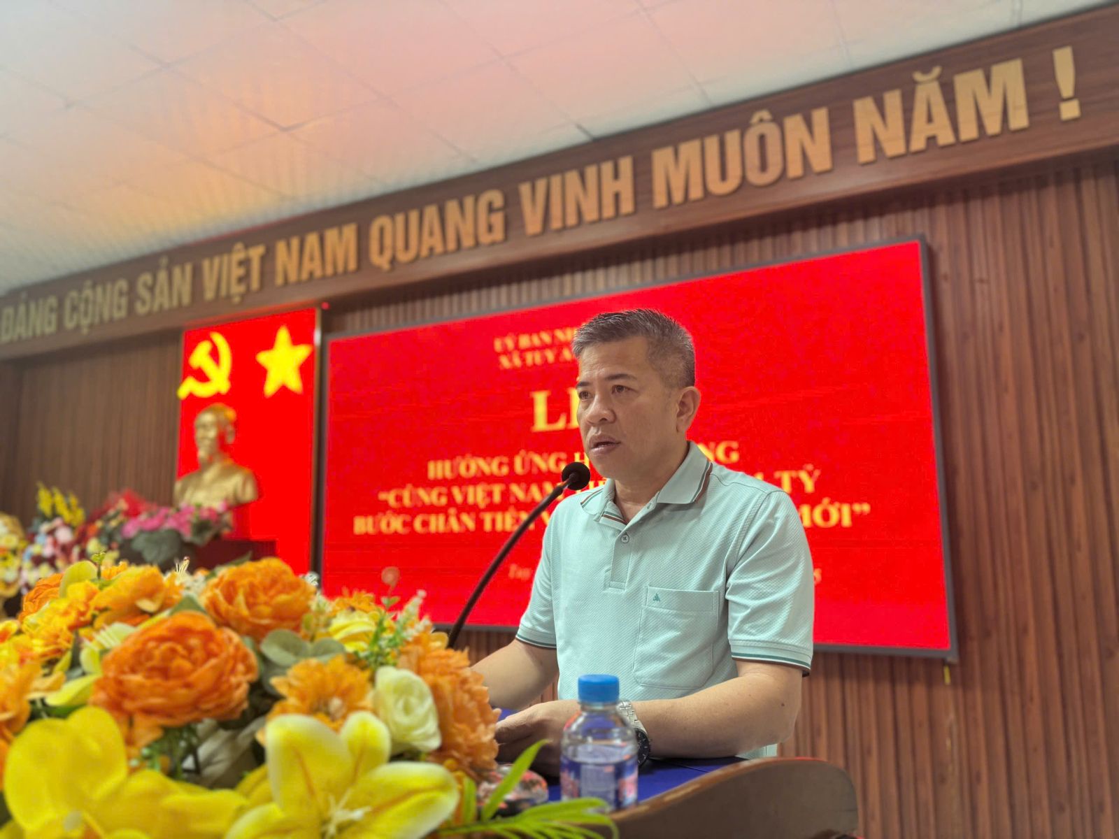 Phát biểu tại buổi lễ đồng chí Trần Văn Biên, Chủ tịch UBND xã nhấn mạnh: Đây không chỉ là một sự kiện thể thao hưởng ứng cuộc vận động “Toàn dân rèn luyện thân thể theo gương Bác Hồ vĩ đại” và phong trào “Khỏe để xây dựng và bảo vệ Tổ quốc” mà còn là hành trình của triệu trái tim cùng hòa nhịp – nơi hội tụ mọi thế hệ, mọi tầng lớp nhân dân từ trung ương đến địa phương, từ thành thị đến nông thôn, miền núi, vùng sâu, vùng xa. Mỗi địa phương cùng góp một phần sức mạnh cùng chung bước vì một mục tiêu lớn lao: Vì một Việt Nam đoàn kết, mạnh mẽ, sẵn sàng vươn mình bước vào kỷ nguyên mới – kỷ nguyên của khát vọng dân tộc, của tinh thần tiến bước vì tương lai hùng cường. Sự kiện “Cùng Việt Nam tiến bước” không chỉ là một hoạt động thể chất cộng đồng đơn thuần mà là một hành động tập thể giàu ý nghĩa chính trị - xã hội, biểu thị sự quyết tâm của toàn dân tộc trong việc cùng nhau vượt qua khó khăn, giữ gìn sức khỏe, tăng cường đoàn kết hướng tới mục tiêu phát triển bền vững, hội nhập mạnh mẽ trong kỷ nguyên mới. Đặc biệt, ngành Công an không chỉ triển khai tuyên truyền vận động mà cũng tham gia cùng đi bộ, với tinh thần một giờ một tỷ bước chân vì một Việt Nam khỏe mạnh, đoàn kết, tiến bộ, hoạt động “Cùng Việt Nam tiến bước” là một trong những hoạt động cụ thể thiết thực xây dựng môi trường lành mạnh, nâng cao thể chất, tinh thần vào việc tuyên truyền pháp luật cho người dân; xây dựng phong trào toàn dân bảo vệ an ninh bảo vệ Tổ quốc.