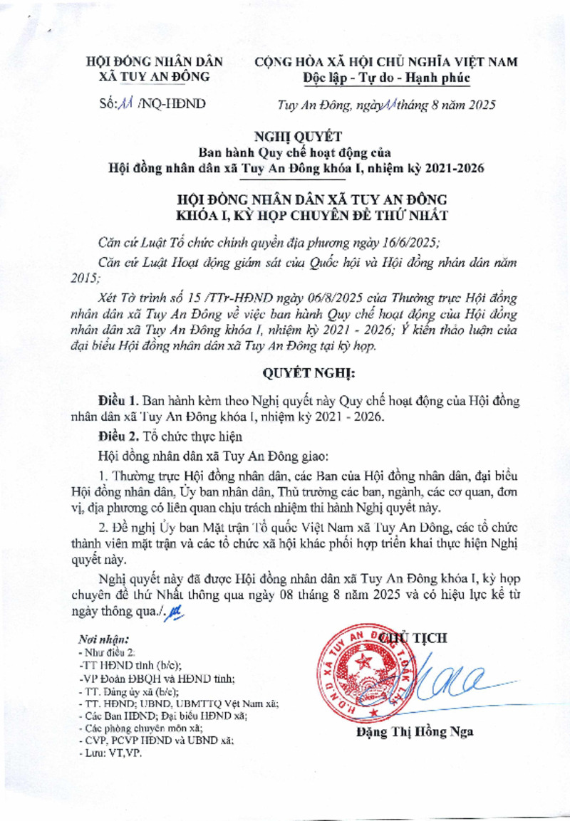 | Tiêu đề văn bản | Ban hành Quy chế hoạt động của Hội đồng nhân dân xã Tuy An khóa I, nhiệm kỳ 2021 - 2026 | ||