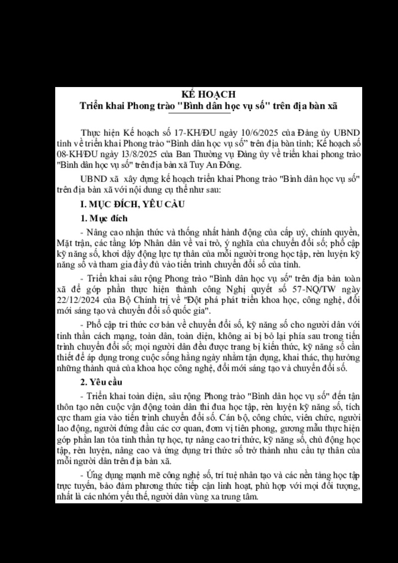 Tiêu đề văn bản | Kế hoạch Triển khai Phong trào "Bình dân học vụ số" trên địa bàn xã | ||