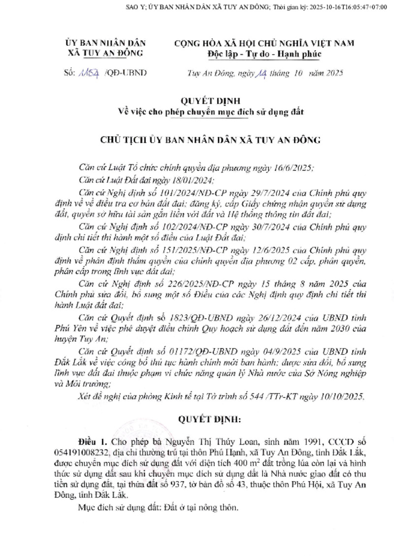| Tiêu đề văn bản | Về việc cho phép chuyển mục đích sử dụng đất bà Nguyễn Thị Thúy Loan | ||