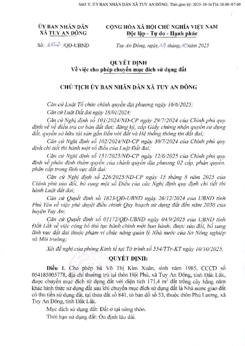 | Tiêu đề văn bản | Về việc cho phép chuyển mục đích sử dụng đất bà Võ Thị Kim Dung | ||