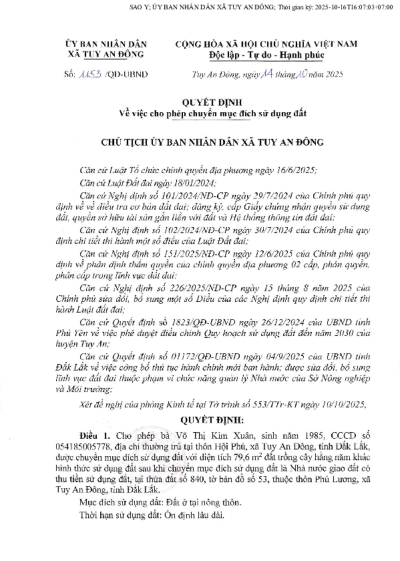 | Tiêu đề văn bản | Về việc cho phép chuyển mục đích sử dụng đất bà Võ Thị Kim Dung | ||