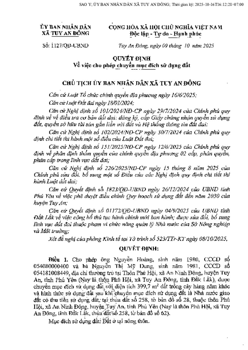 | Tiêu đề văn bản | Về việc cho phép chuyển mục đích sử dụng đất ông Nguyễn Hoàng và bà Nguyễn Thị Mỹ Dung | ||
