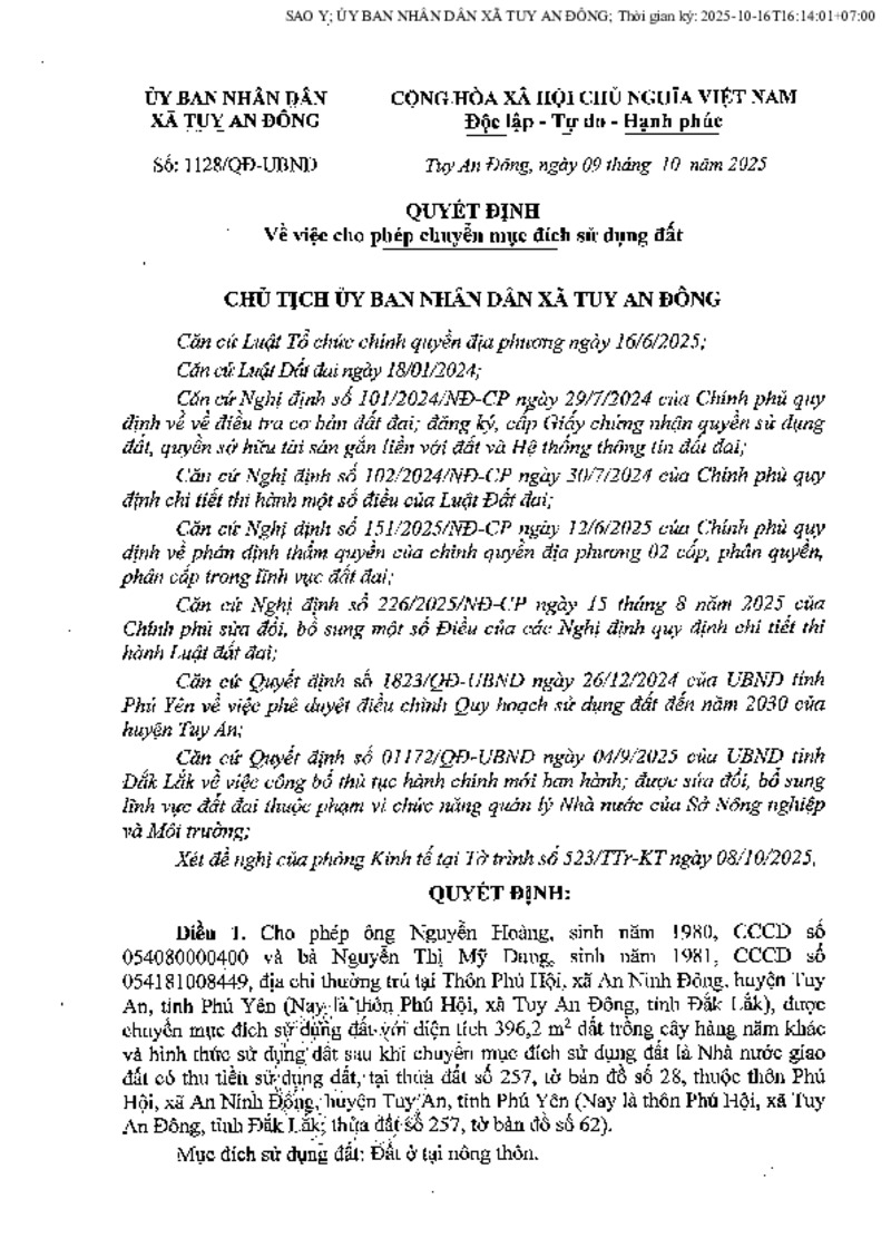 | Tiêu đề văn bản | Về việc cho phép chuyển mục đích sử dụng đất ông Nguyễn Hoàng và bà Nguyễn Thị Mỹ Dung | ||