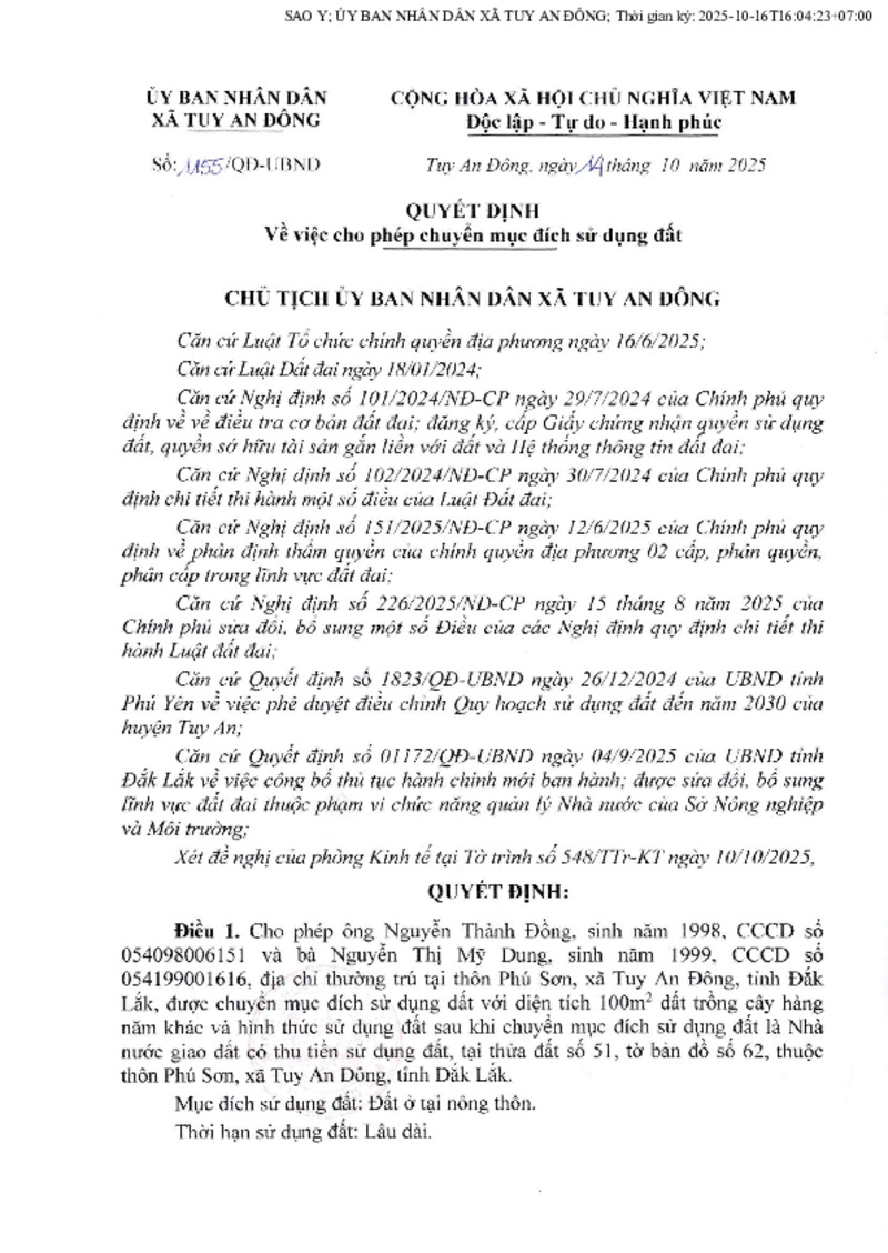 | Tiêu đề văn bản | Về việc cho phép chuyển mục đích sử dụng đất ông Nguyễn Thành Đồng và bà Nguyễn Thị Mỹ Dung | ||