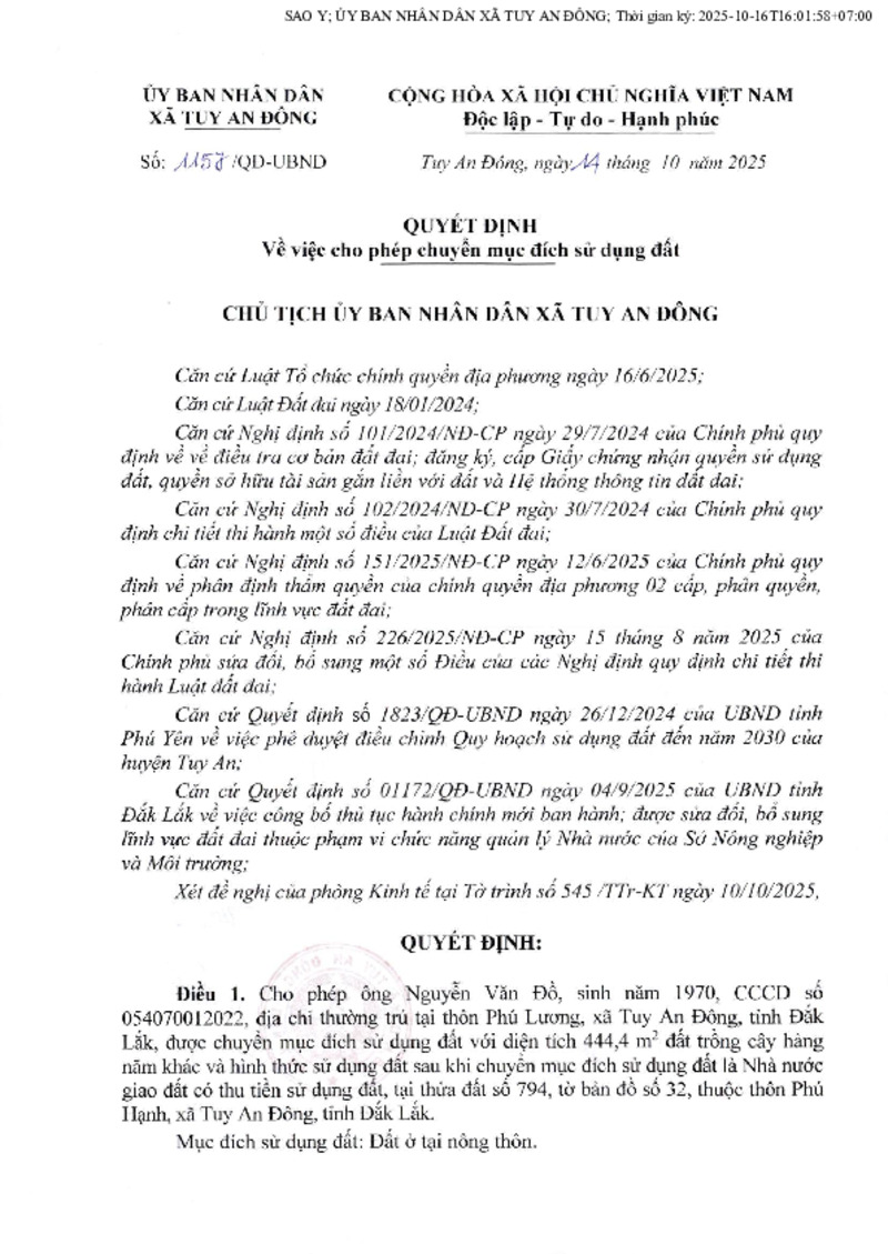 | Tiêu đề văn bản | Về việc cho phép chuyển mục đích sử dụng đất ông Nguyễn Văn Đồ | ||