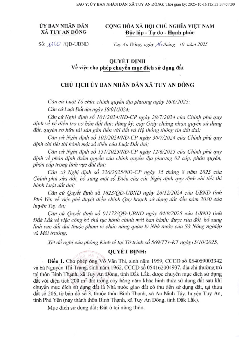 | Tiêu đề văn bản | Về việc cho phép chuyển mục đích sử dụng đất ông Võ Văn Thi và bà Nguyễn Thị Trang | ||