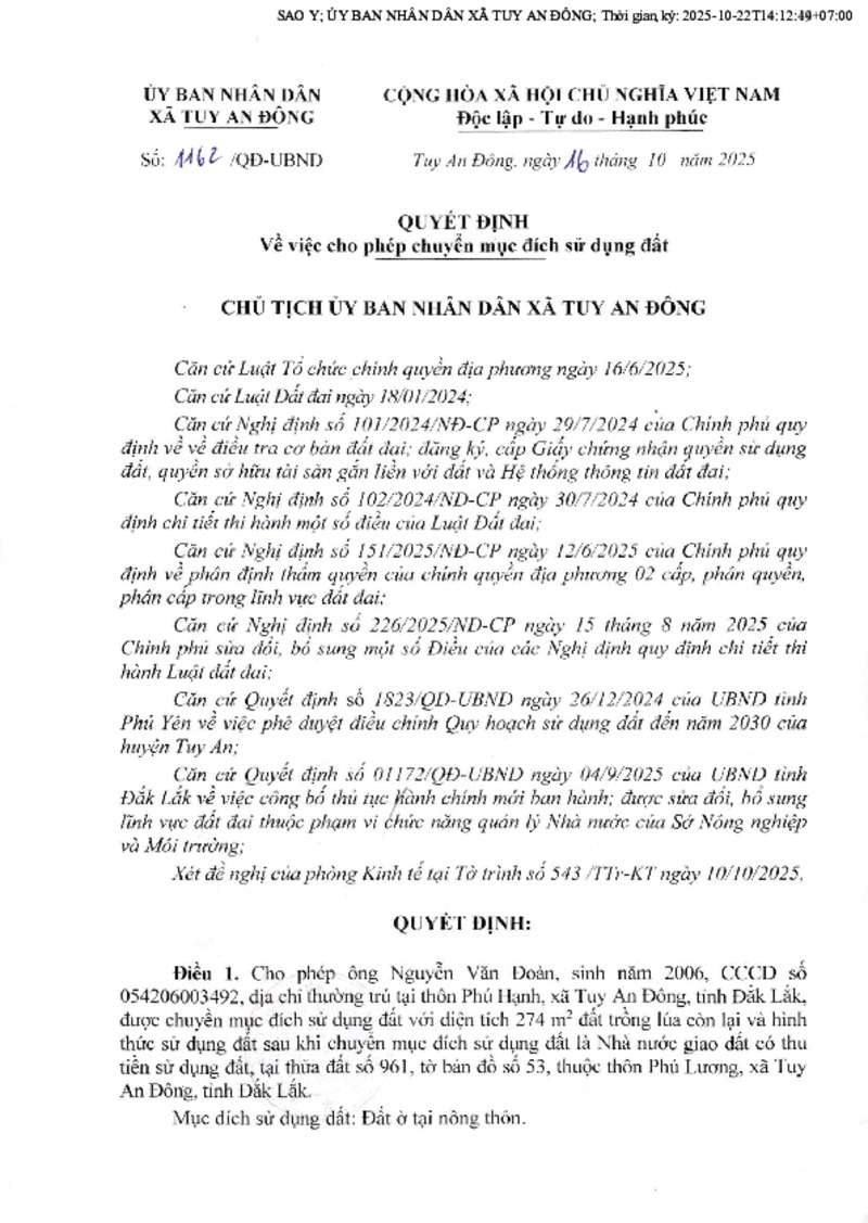 | Tiêu đề văn bản | Về việc chuyển mục đích sử dụng đất ông Nguyễn Văn Đoàn | ||